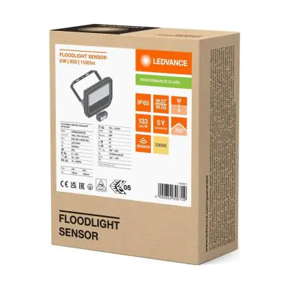 Descrizione Ledvance Proiettore LED Aluminium Bianca 8W 1100lm 100D - 830 Luce Calda - | IP65 - Sensore Di Movimento E Luce - Simmetrico