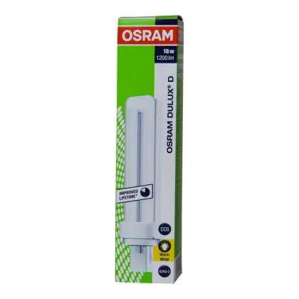 Questa lampada fluorescente compatta Dulux D OSRAM presenta l’attacco a innesto G24d-2 con due spinotti. Grazie alla tecnologia a fluorescenza, è un’ottima soluzione per un’illuminazione affidabile con un consumo energetico di 18W. È adatta per un’installazione negli apparecchi luminosi dotati di alimentatore convenzionale.