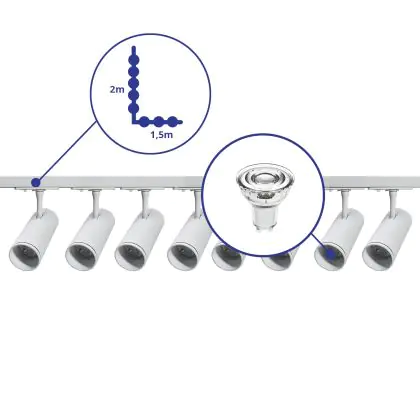 Descrizione Set completo 1-Fase Rail L 1,5 x 2 Metro Bianca | incl. 8x Faretti + GU10 2700K 3W Dimmerabile + Tappo Di Chiusura, Connettore di Alimentazione e L -Connettore