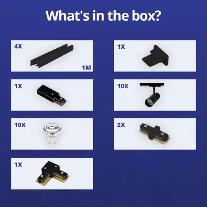 Descrizione Set completo 1-Fase Rail L 2 x 2 Metro Nero | incl. 10x Faretti + GU10 2700K 3W Dimmerabile + Tappo Di Chiusura, Connettore di Alimentazione e L -Connettore